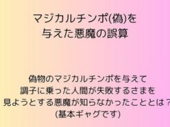 マジカルチンポ(偽)を与えて 調子に乗った人間が失敗するさまを見ようとする悪魔の誤算。 (基本ギャグです) 本編はこちら▶▶ 発売日 : 2025-11-07収録 : 12ページジャンル : ギャグ・コメディ 中出し 男性向け 成人向け サークル : rpmカンパニー 品番 : d_698301価格 : ¥110 続きを読む▶▶ マジカルチンポ(偽)を与えた悪魔の誤算は無料で読める? マジカルチン